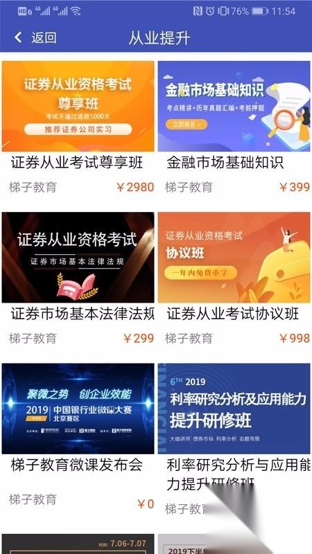 梯子教育服务云平台 梯子教育服务云平台作为一款金融教育服务软件,借助大数据与云计算技术,为用户打造更卓越的学习服务。在这款应用里,用户能够学习各类金融知识,实现自身学习水平的提升。面对当下的AI技术与5G时代,该APP凭借先进技术,为金融教育行业输送更为优质的学习服务,致力于重塑金融教育行业格局。我们不仅能切实提升行业内部效率,还能增强外部服务能力,从而助力每一位金融学习者。梯子教育服务云平台APP汇聚海量优质名师与教育机构,专注于帮助用户强化金融知识文化,培育金融行业实操人才。平台拥有丰富的课程资料,用户可毫无限制地在线学
