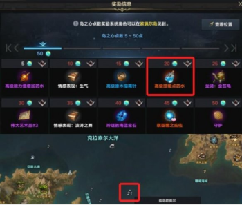 收集满20个岛之心后可在孤岛欧佩尔兑换高级技能点药水。
