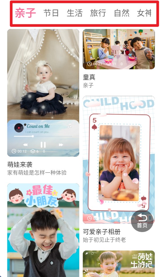 2. 点击上方的分类栏目,您可以选择亲子、生活等不同的主题。