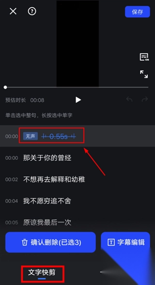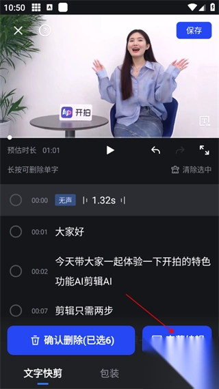 3、可智能别视频:语气词,无声片段,重复片段,选中即可一键删除,快速提高剪辑效率!