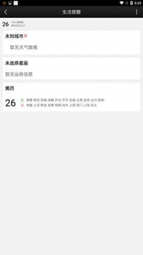 3、当点击【生活提醒】后,我们便能够看到更为详细的天气数据、星座运势以及黄历等相关内容。