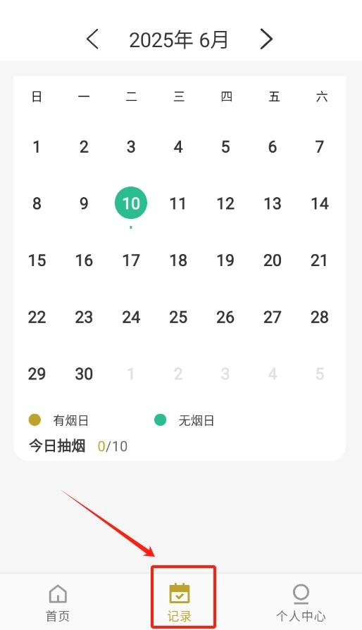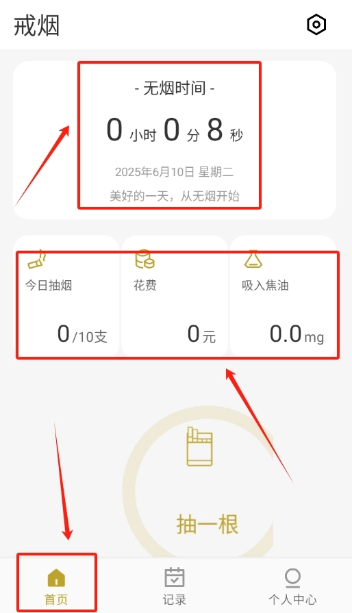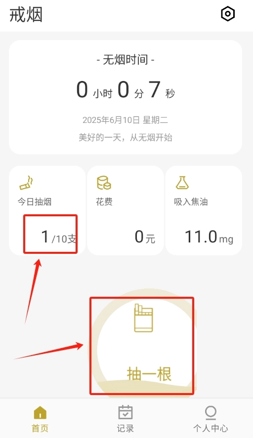 1、打开软件进到首页,能看到记录抽烟数量的地方,直接把当天抽烟数记下来。