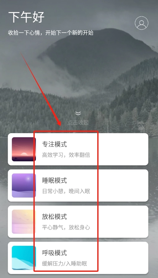 1、下载安装后打开 APP,根据需求选择专注、睡眠、放松或呼吸模式进入使用。