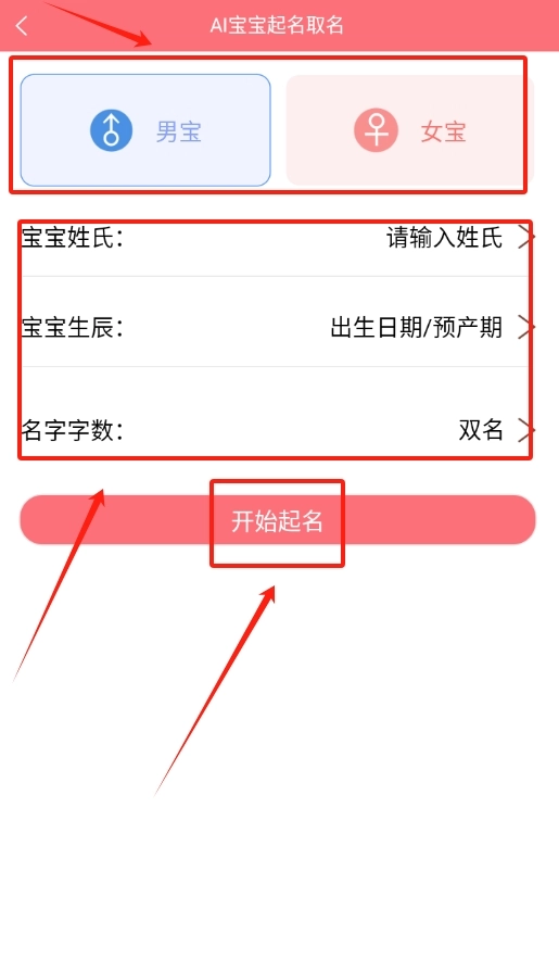 3、接下来,选好宝宝性别,接着输入宝宝姓氏、出生时辰,以及我们想要设定的名字字数,全部设置完成后,点击“开始起名”即可。