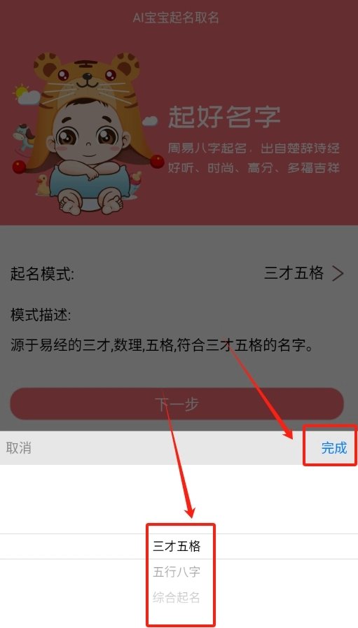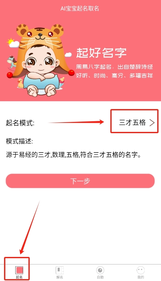 1、打开咱们这个起名软件,一进首页,就能瞅见 “起名模式” 几个大字,果断点它。