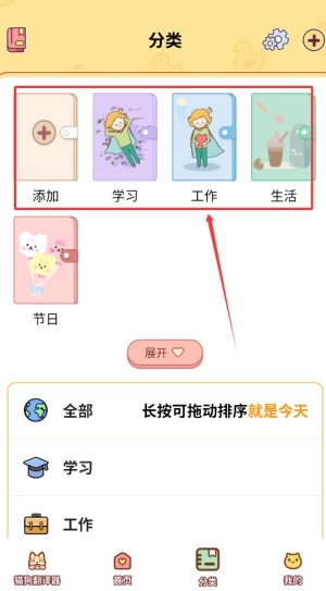 3、进入分类,可以添加学习,工作,生活等等需要记录的事情。