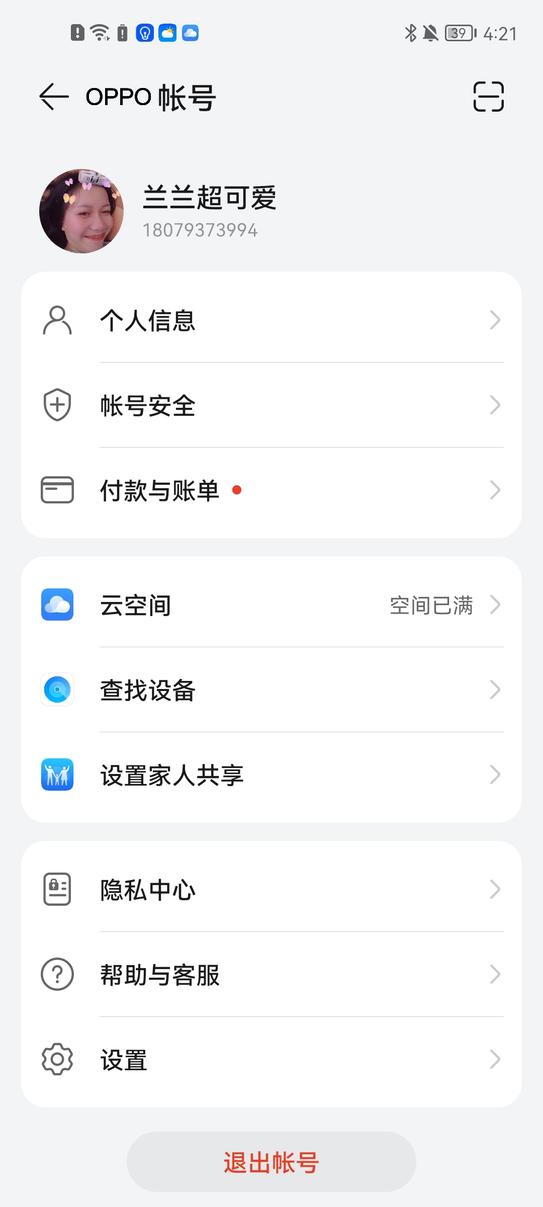 2. 开启oppo手机的设置,在页面顶端轻点已登录的个人账号,从而进入账号管理设置界面。