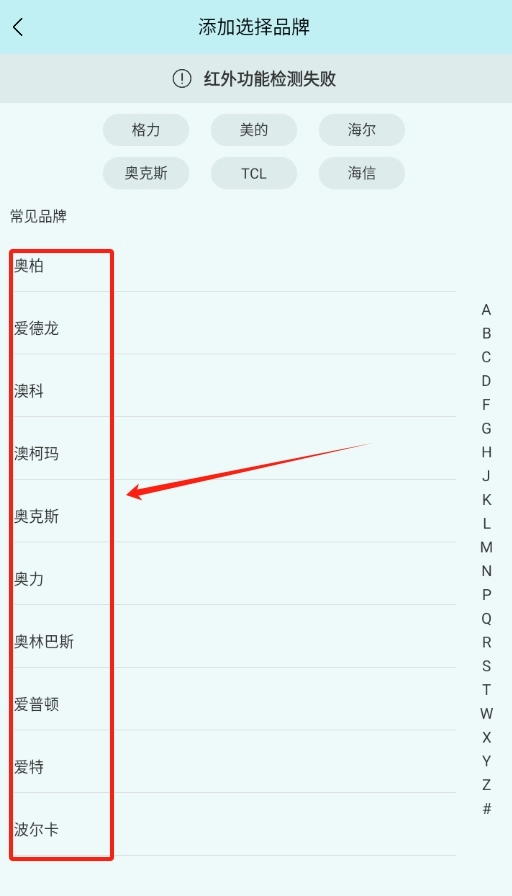 2、在品牌列表里找到想添加的空调品牌,点击选择对应的品牌名称。