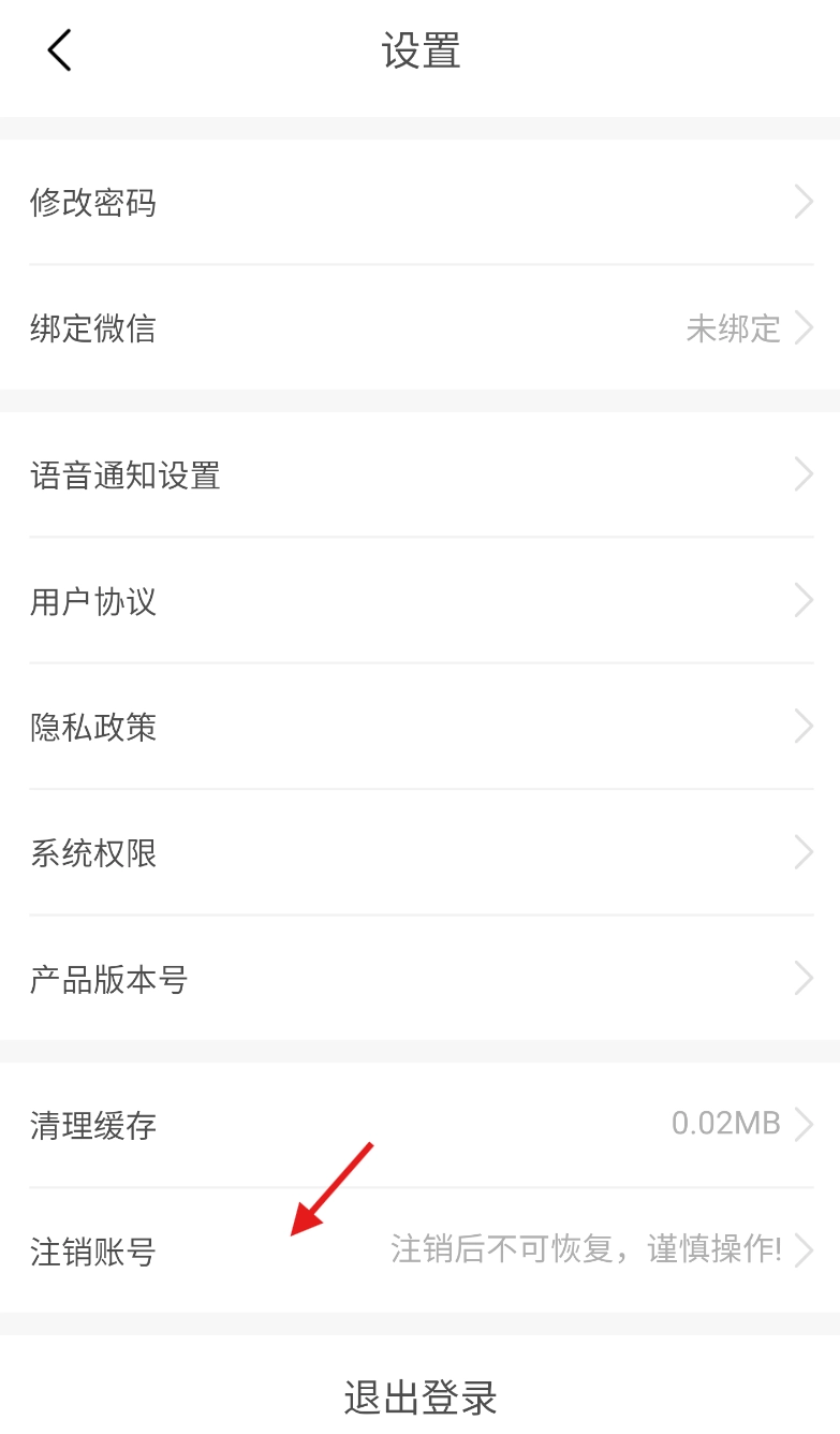 3、进入设置页面后,下滑找到 “注销账号” 功能按钮,点击该按钮继续操作。