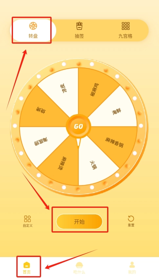 1、下载安装今天吃什么转盘软件,打开后从大转盘、抽签、九宫格三种形式中选择。