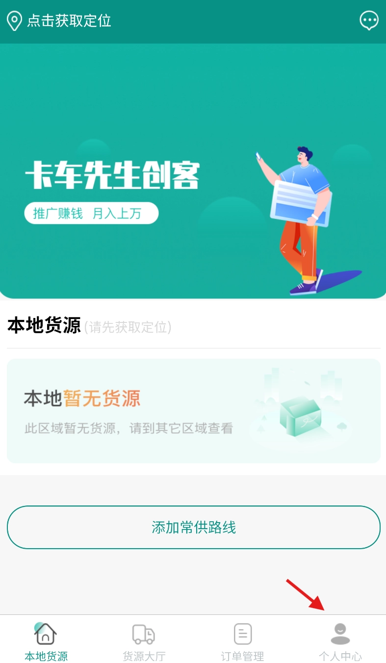 1、打开手机上的卡车先生平台,进入主界面后,轻点底部菜单栏中的 “个人中心” 选项。
