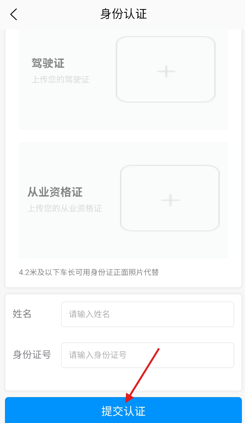 3、按顺序上传身份证,如实填写相关信息,接着录入驾驶证与从业资格证的资料,确认没有错误后点击提交,完成认证。