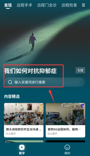 1、登录红云医疗医生版APP后,在首页顶部搜索栏输入关键词,可快速查找专业医学资讯。