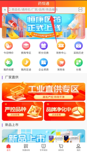 1、启动恒康药联APP后,在首页搜索框直接输入药品名称或症状关键词,快速查找所需药品。