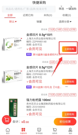 2、进入"快速抢购"通道,系统会根据历史订单智能推荐常购药品,缩短选购时间。