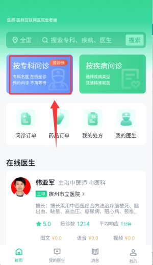 1、进入医群APP后,在首页选择"专科问诊"功能,根据症状选择对应的科室分类。