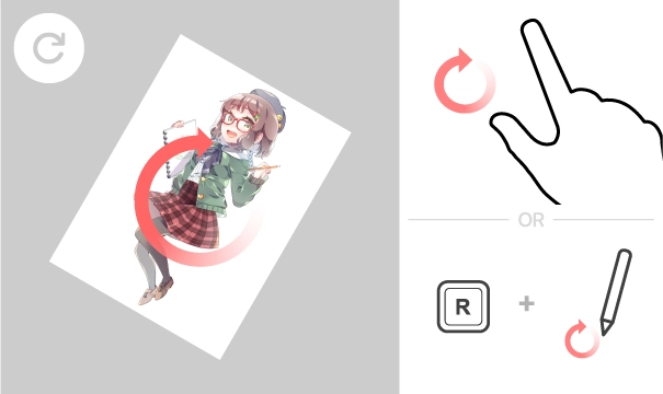 您能够通过使用两根手指在画布上做圆周拖动操作,以此来旋转画布。要是连接了蓝牙键盘或者USB键盘,还能够通过按住[R键],同时循环拖动笔,从而实现画布的旋转。