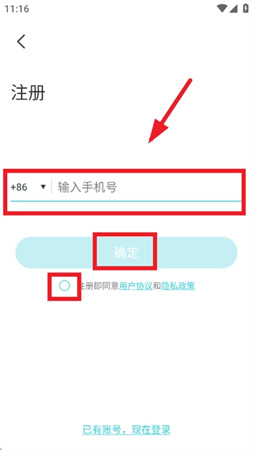 请输入手机号码,勾选“注册即同意用户协议和隐私政策”,然后点击“确定” 。