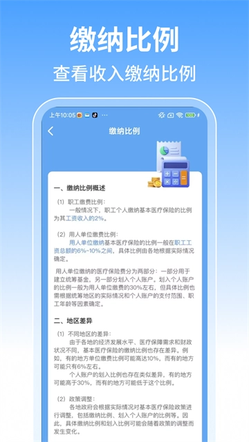 用户借助软件,能够知晓各地区最低工资信息,以及医保缴纳比例、医保涵盖药物等医保基本信息,从而对医保政策、药品及缴费情况有更清晰的认知。软件还具备职工医疗保险计算功能,用户只需输入每月工资、公司与个人的缴纳比例,即可得出计算结果。
