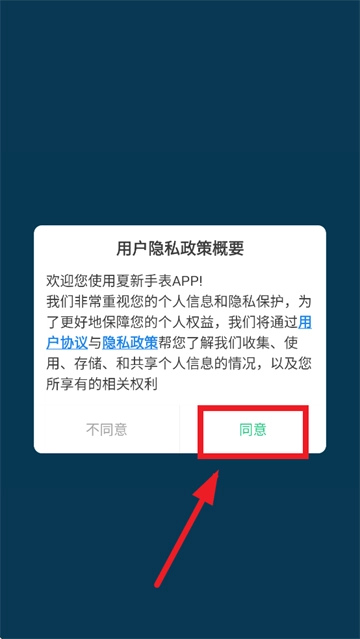 请下载并安装夏新手表app,安装完成后打开该应用程序。打开应用后,首先需同意用户隐私政策概要。
