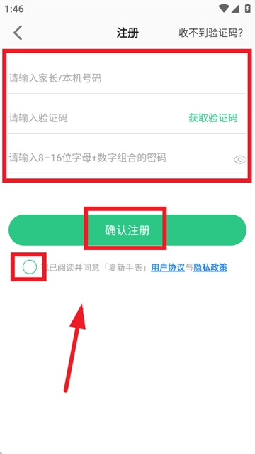请依次输入手机号、验证码以及密码,勾选“我已阅读并同意《夏新手表用户协议与隐私政策》”,随后点击“确认注册”,便可完成注册流程。