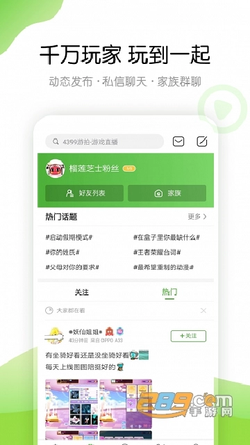 -- 千万玩家,玩到一起,动态发布,私信来哦天,家族群聊