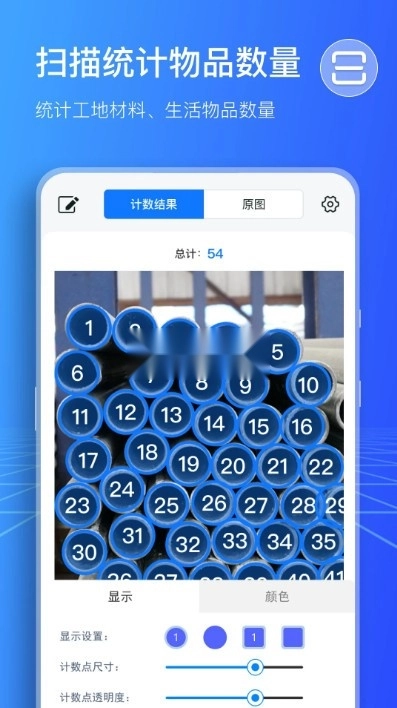 智能扫描计数工具APP功能超强大!它涵盖钢管计数、钢筋计数、盘扣计数等诸多实用功能。使用时,只需对要计数的物品拍照,标识其中一个物体,软件就能快速算出结果,操作简单便捷,方便又实用。 不仅如此,这款APP还细致划分不同类型区域的工具,文件扫描存储、精准识别文字、PDF转换处理等功能一应俱全。不过,用户在使用扫描计数王APP的功能前,需获取手机相机权限,才能对物品进行扫描。扫描得到的结果会自动保存到手机,方便后续使用。