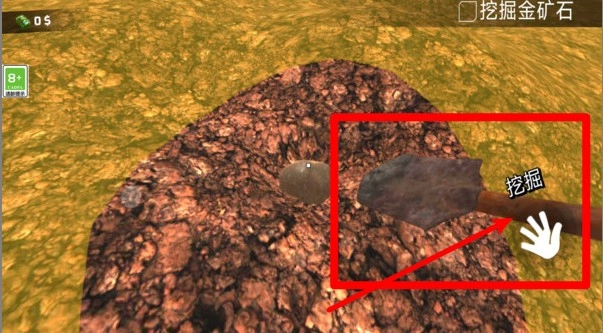 2.手动进行挖掘:点击铲子进行挖掘操作,在目标位置反复敲击泥土,直到发现金矿或宝石资源为止。