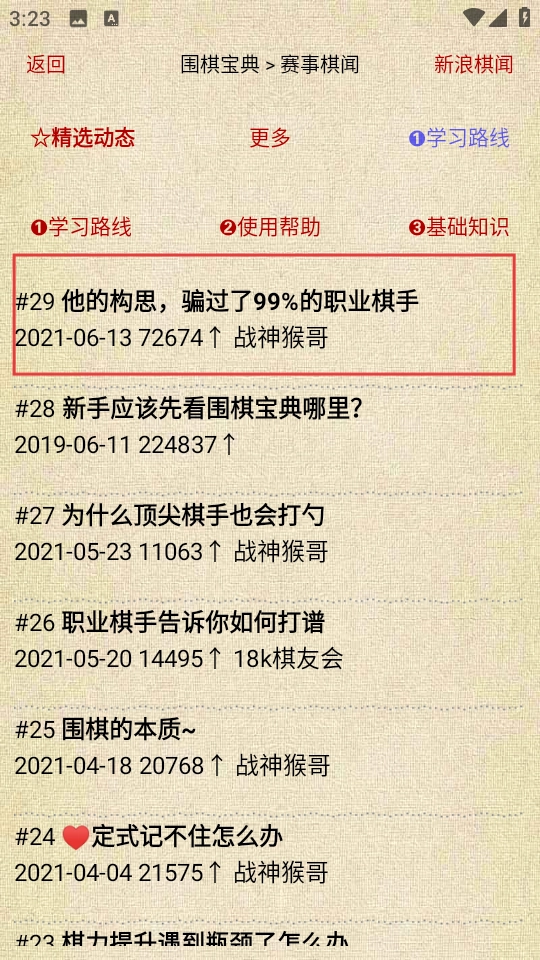 2. 在赛事棋闻页面选择第29条动态,查看精选内容。