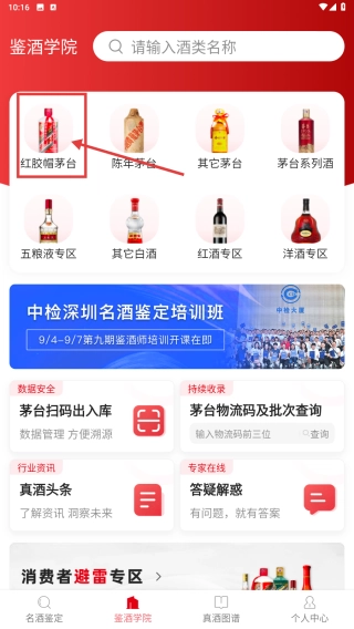 2、于鉴酒学院页面,点击红胶帽茅台这一分类,随即进入红胶帽茅台相关内容的界面。