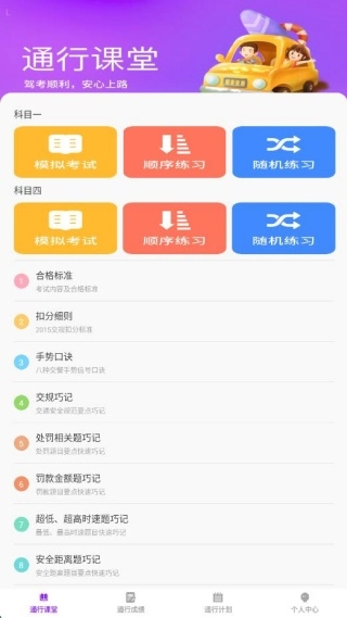 1. 在通行课堂中,提供了科目一、科目四的习题与真题,可随时进行训练。