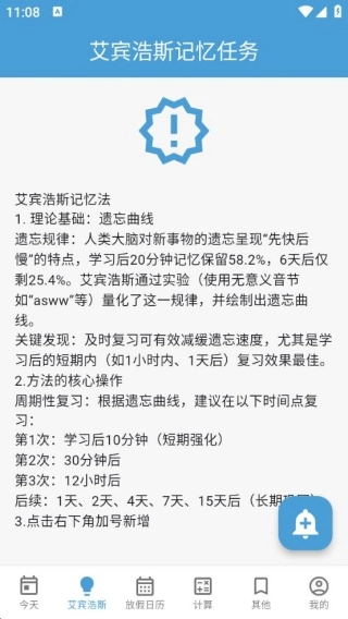 3、具备添加自定义备忘任务并触发提醒的功能,而且能依据艾宾浩斯记忆法设定周期性复习提醒,助力记忆学习内容或重要事项。
