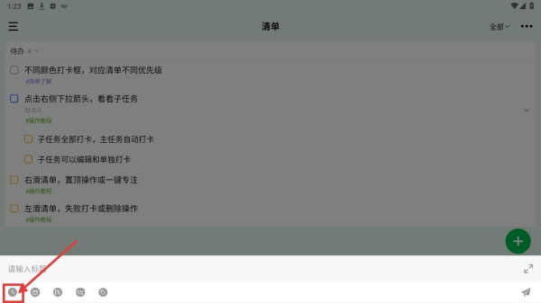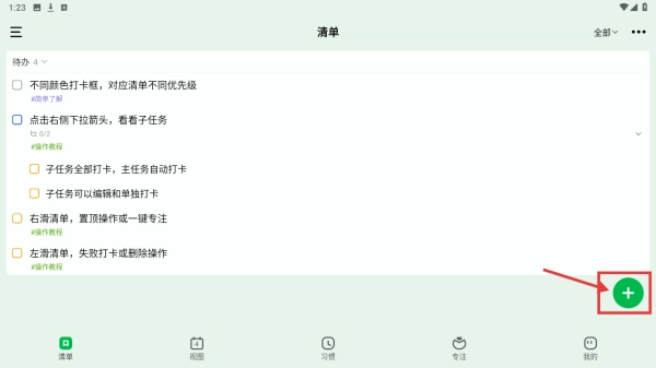 1. 开启清单管理类应用程序,轻点页面右侧的绿色“+”按钮,从而触发添加清单或者日程的相关操作。