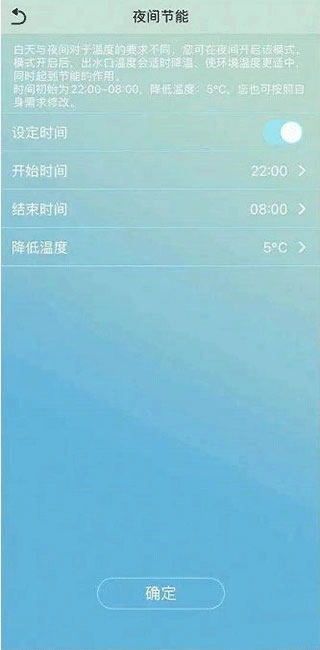 3、各位还能够启用夜间模式,在设定的时间范围内,出水温度会自动降低5℃(该温度降幅可按需调整)。稍低一些的室温,既有助于节能,又更有利于提升睡眠质量。