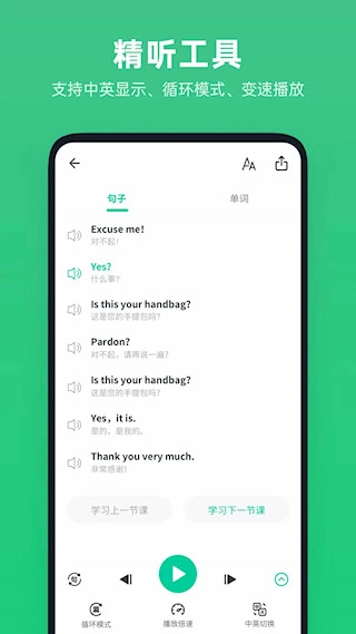 2、个性化学习体验:依据学习者的实际水平与具体需求,定制个性化学习计划,同时支持多种播放模式,并可灵活调整语速,全方位契合不同的学习习惯。
