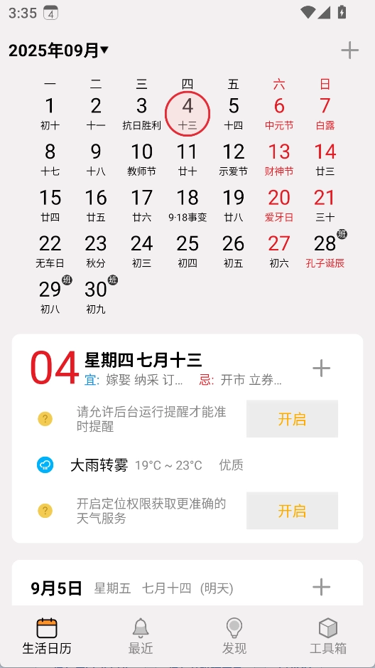 1. 开启生活日历,便能瞧见当月的节假日、天气以及黄历等相关信息。