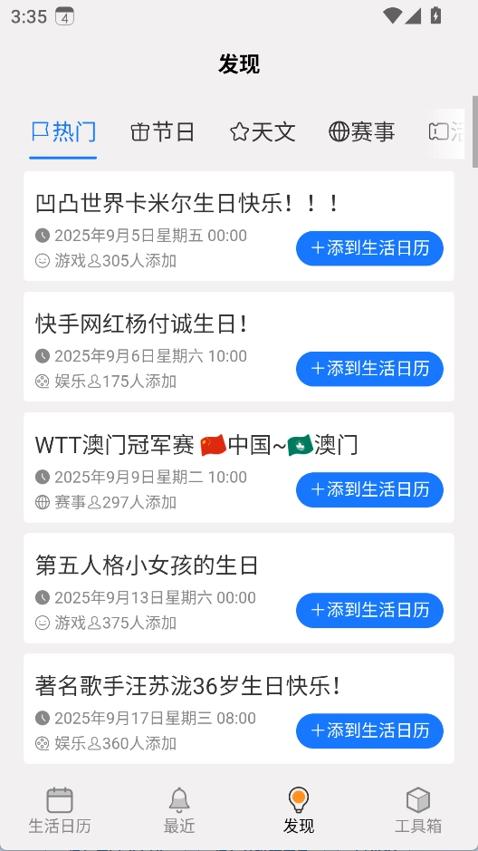 2、发现界面涵盖节日、赛事等多领域的资讯内容。