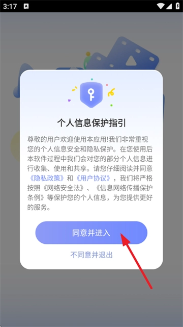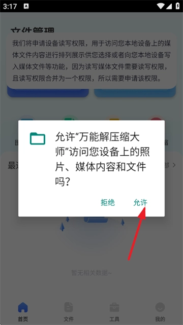 1、第一步,打开万能解压缩大师,仔细阅读《隐私政策》与《用户协议》后,表示同意。