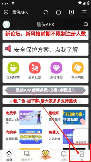 2、进入黑侠apk的主页,就能看见相关游戏辅助工具,接着选择右下角的“我的页面”。