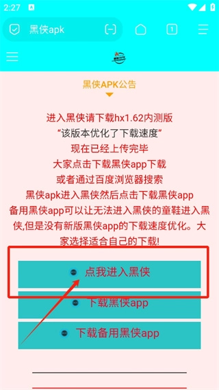 如何登录黑侠apk呢? 1、第一步,打开黑侠apk软件,在软件首页点击“点我进入黑侠”。