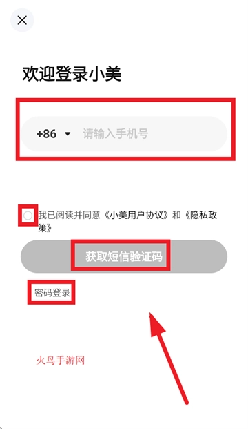 当您进入登录界面,首先在相应位置输入手机号,接着勾选“我已阅读并同意《小美用户协议》和《隐私政策》”,之后点击“获取短信验证码登录”就能完成登录操作。另外,您也可以选择点击“密码登录”,通过输入手机号和密码来实现登录。