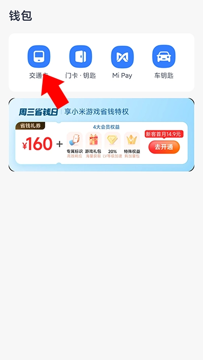 1、打开小米钱包,找到并点击交通卡选项,具体位置参照图示。