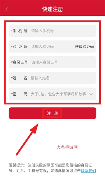 于快速注册页面,依次填入手机号、验证码、身份证号、姓名及密码,随后点击“注册”按钮,便可完成注册。