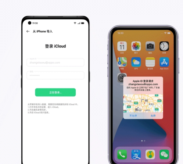 当苹果手机弹出iCloud账号登录请求弹窗时,点击“允许”。接着在OPPO新手机上输入iCloud的验证码,就能成功连接。