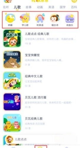 包含宝宝巴士原创儿歌动画、贝瓦儿歌、兔小贝儿歌、儿歌串烧,还有儿歌多多里的精选内容。