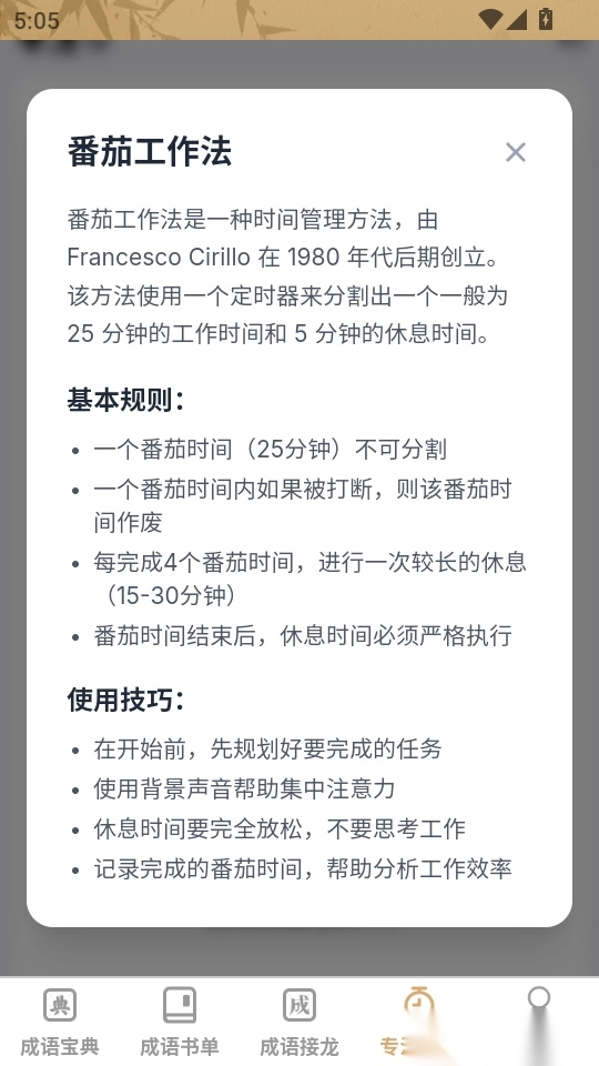 3. 随后会弹出“番茄工作法”的提示窗口,其中展示了使用技巧与基本规则,接着点击“X”按钮,便可进入下一步。