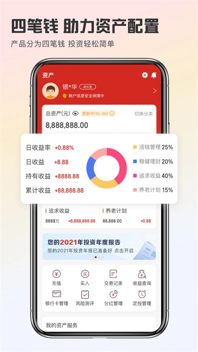 3. 理财服务:银华凭借专业的资产配置团队,为用户精心打造积极、稳健、保守这三种投资组合方案,助力用户轻松理财,省心无忧。