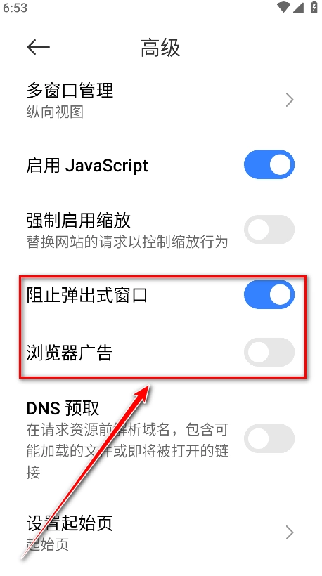 4. 如以下图示,开启阻止弹出式窗口功能,关闭浏览器广告即可。