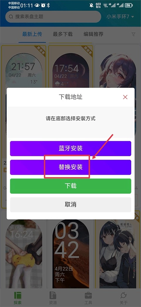 2、完成表盘操作后,在弹出的窗口中选择“替换安装”,如此便可以将原有的表盘替换掉。