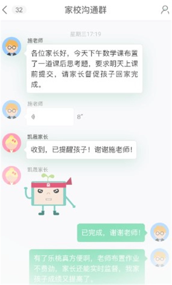 乐桃这款软件,为学校与家长搭建起社交桥梁。借助它,用户不仅能获取高质量的学习报告,清晰了解自家孩子的学习状况,还能随时通过软件督促孩子学习,带来优质的学习监督体验。